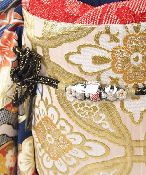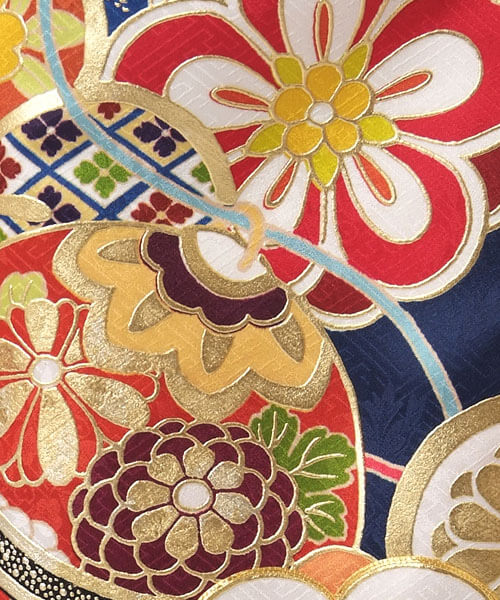 赤やオレンジ、ゴールドの花模様や鞠模様が