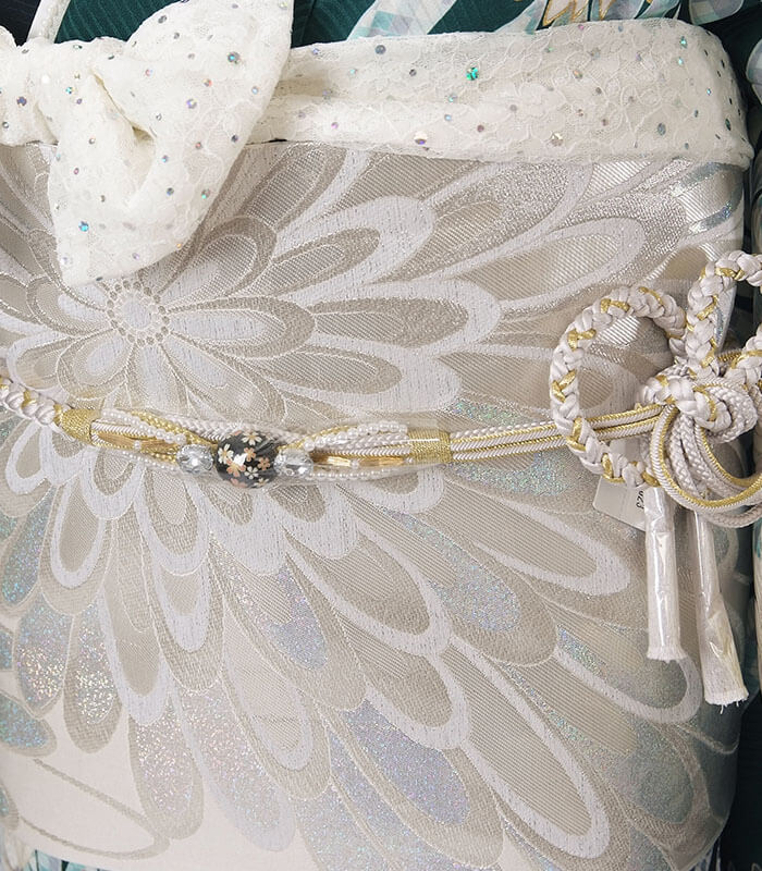 帯締めは白のレース素材に